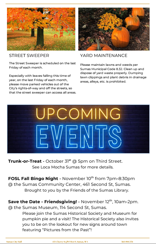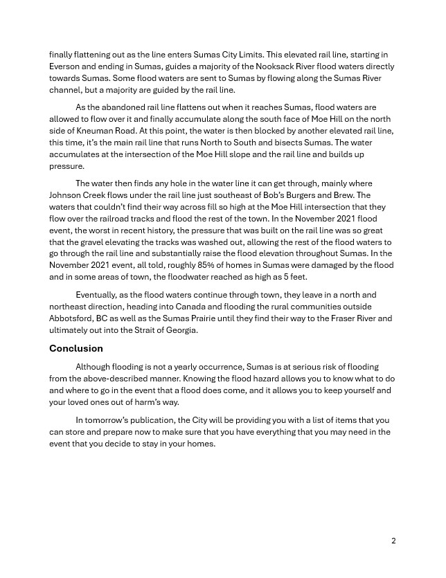 Next week, the City of Sumas will be putting on Flood Awareness Week. Throughout the week, the City will be releasing several helpful publications promoting flood preparedness and safety as we enter Fall and Winter. Below is a timeline of what to expect from the City each day next week: