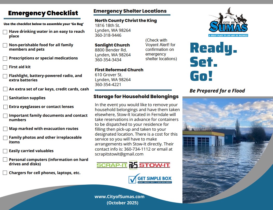 For Wednesday of Flood Awareness Week, the City of Sumas wants to remind residents of the emergency preparedness procedures that are already in place. The system, called Ready, Set, Go!, is a three-stage procedure as the City monitors a potential flood event.