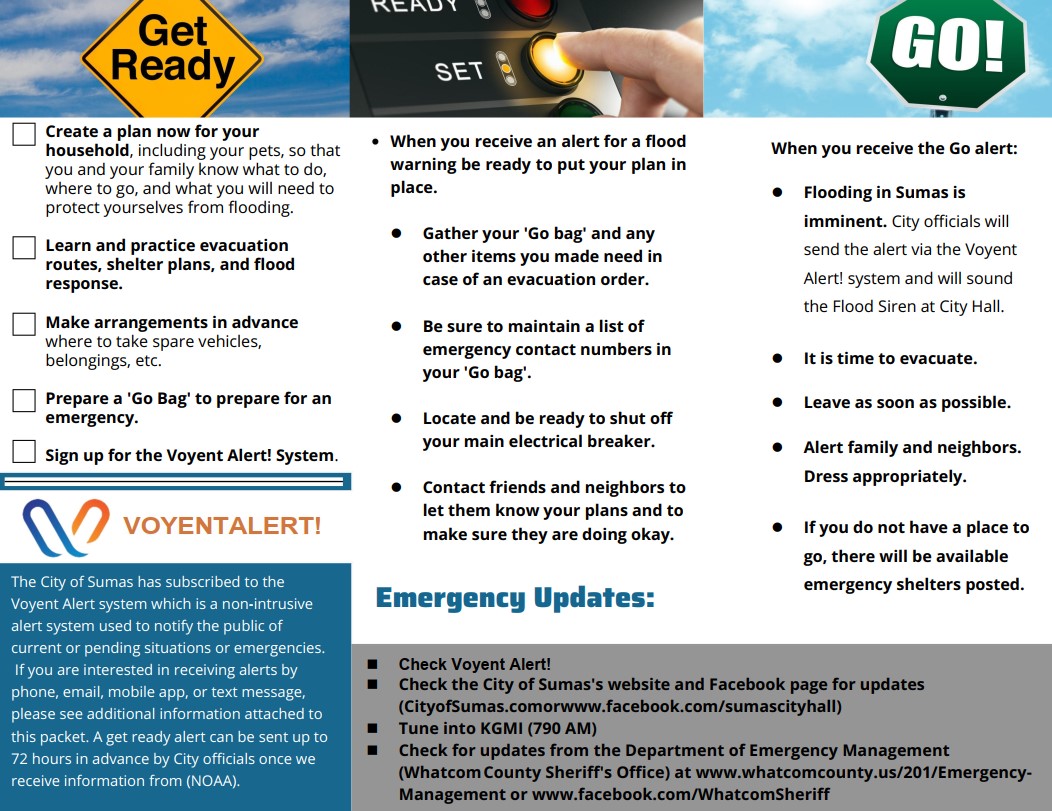 All Sumas residents should be receiving a physical brochure on the Ready, Set, Go! system in their mail sometime next week. We also wanted to post the brochure here as part of Flood Awareness Week, so that as many residents as possible are fully prepared for when these alerts are given.