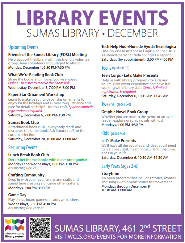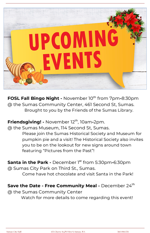 The Sumas Newsletter Issue 6 - 2025 November/December is now available. Take a look for information and updates regarding what's happening in town over the next couple of months!